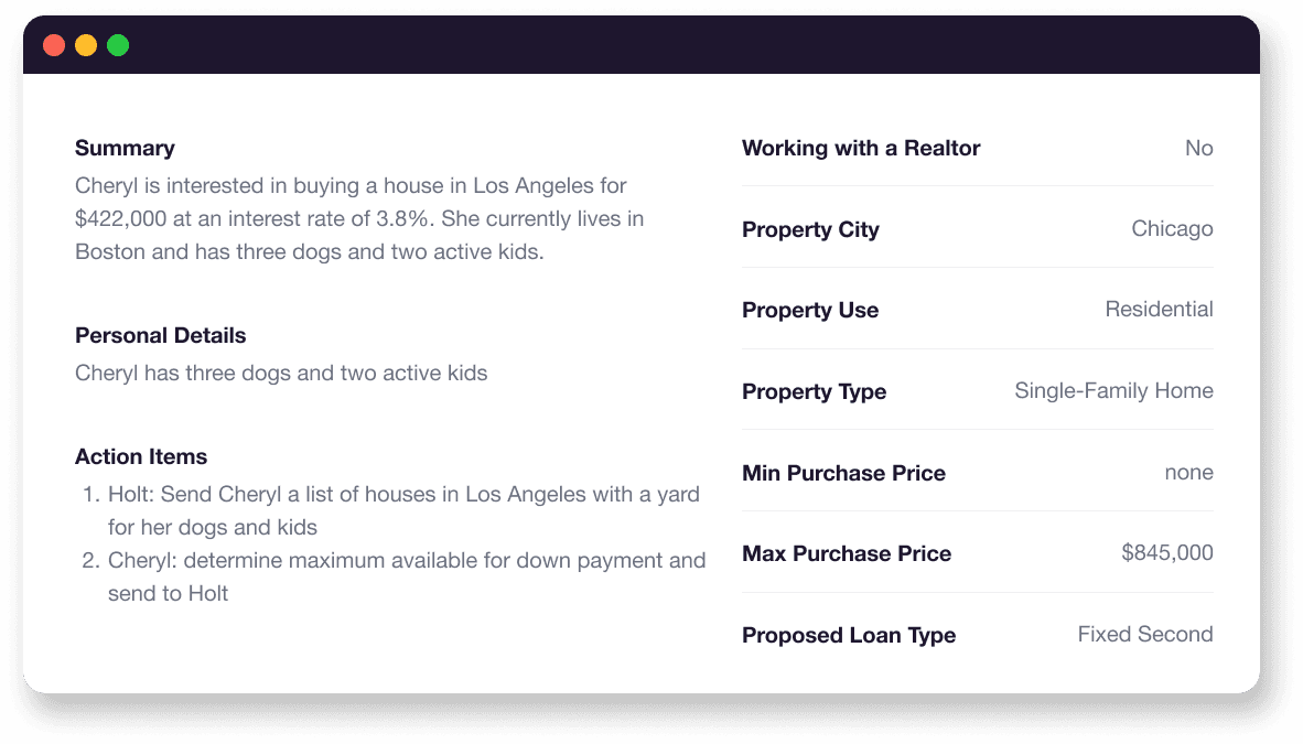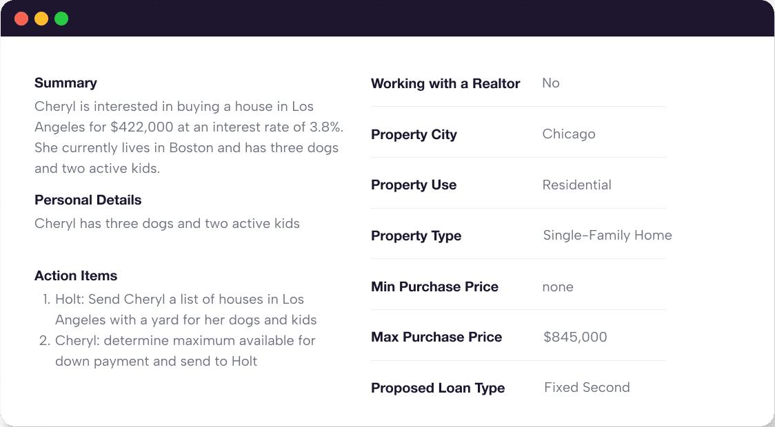 Stop wasting hours updating client data and get back to what matters, calling clients. Within seconds after a call Aila automatically updates fields in your CRM and triggers workflow automation.